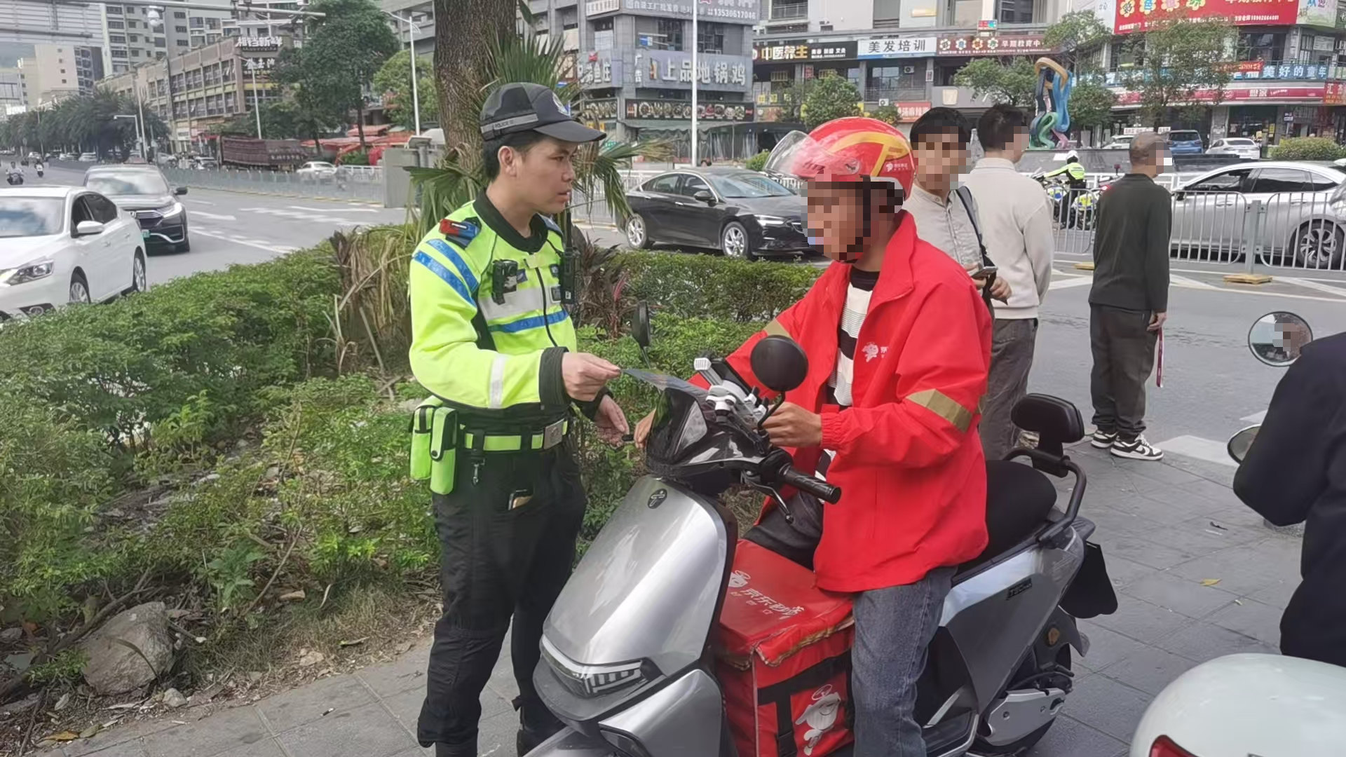 同时,执勤民辅警还推行“体验式执法”模式,邀请轻微违法当事人穿上志愿者马甲,在民辅警的指导下参与路口交通劝导工作,体验维护交通秩序的责任与不易,通过“换位思考”加深对交通法规的理解,自觉摒弃交通陋习,形成“查处一起、教育一片、带动一批”的良好效果。此外,执勤民辅警还向过往群众发放交通安全宣传单张,用通俗易懂的语言讲解安全出行要点、常见违法行为的法律后果及事故防范技巧。